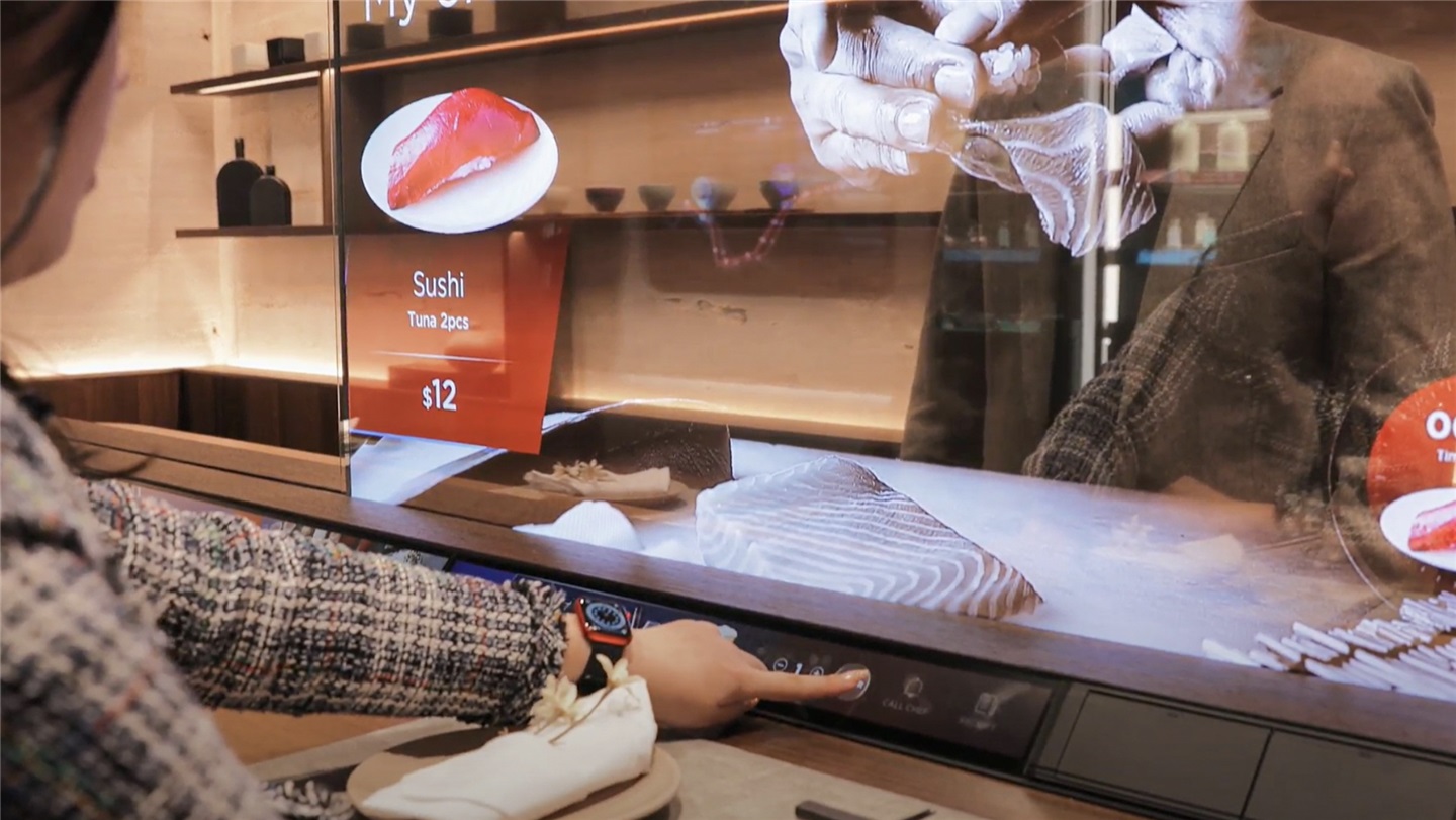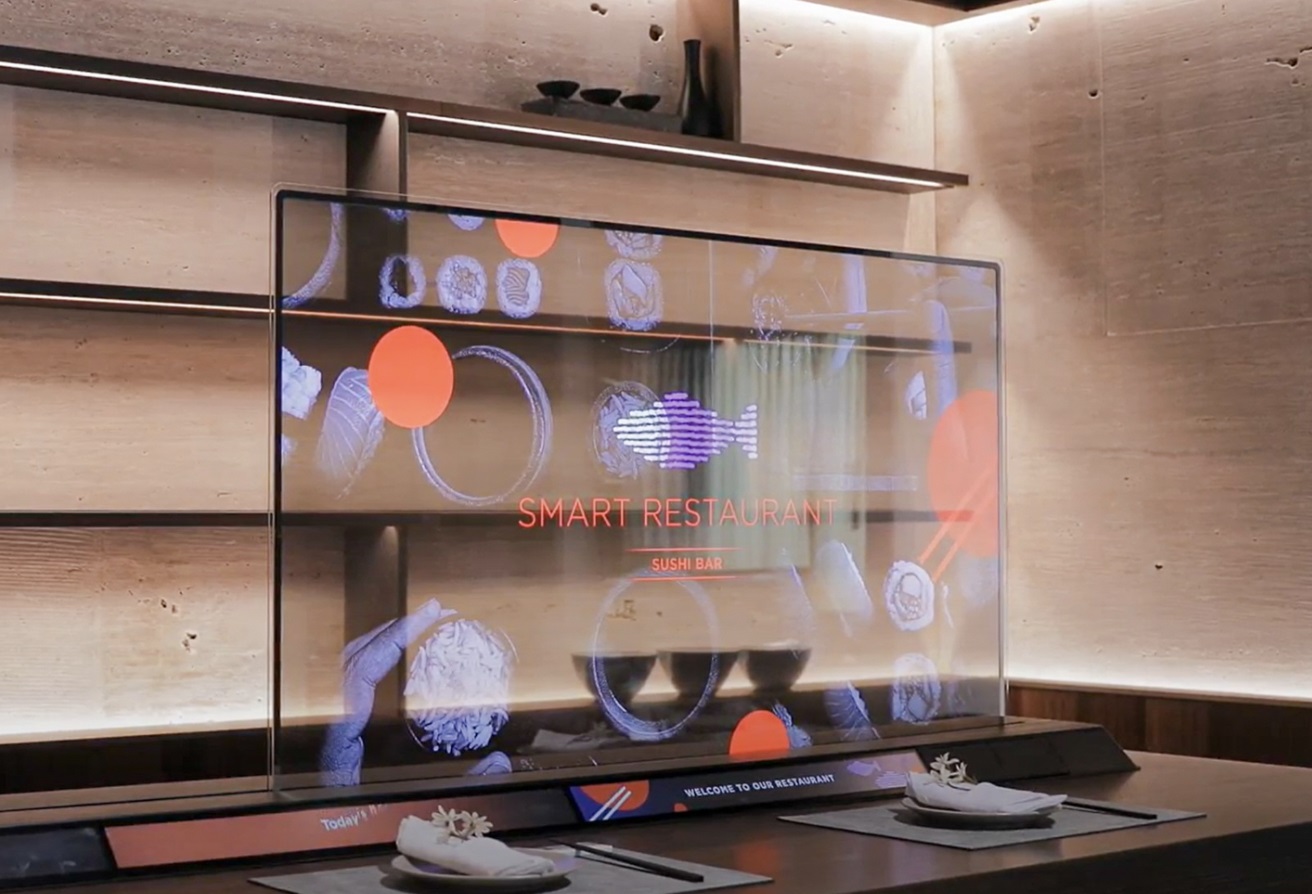 IT之家了解到,在情景展示中,一名顾客坐在一个巨大的 55 英寸的透明 OLED 屏幕前,它可以显示各种菜单项目,甚至体育游戏之类的东西。在演示中,厨师就在显示器后面烹饪食物。因为显示器是透明的,如果顾客需要,可以直接和厨师对话。在 55 英寸的 OLED 屏幕下方,有一个细长的触摸屏,顾客可以通过它购物、选择娱乐节目或呼叫厨师。
