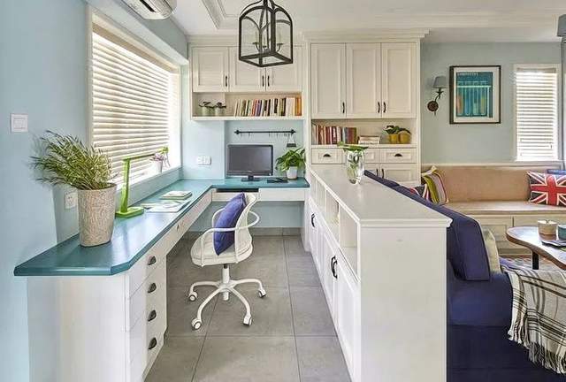 也可以把桌子换成储物柜,这样又同时满足了收纳的要求,房子看起来也会非常清新可爱,柜子上也可以摆放挂画或者各种装饰品。