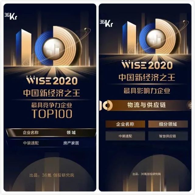 △中装速配荣登36氪「WISE2020中国新经济之王最具竞争力企业TOP100」榜单,荣获智慧供应链赛道「最具影响力企业」奖项