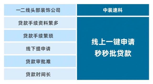 为缓解房产业主买房与装修的双重压力,中装速配,布局“家装分期”的金融板块,成立中装数科事业部。一方面,为广大业主提供家装分期服务,具有无首付、手续少、足不出户、一站贷齐(含家电)等特点,让家装更无忧。一方面,助力房产商与装企提高签单率。集合成交便捷、装修费用低、节省装修时间等优势,获得广大客户的青睐。