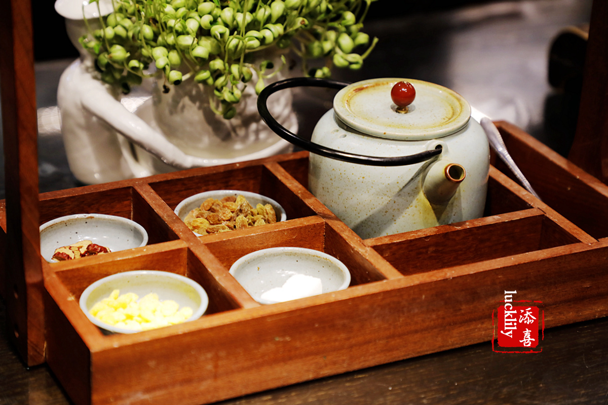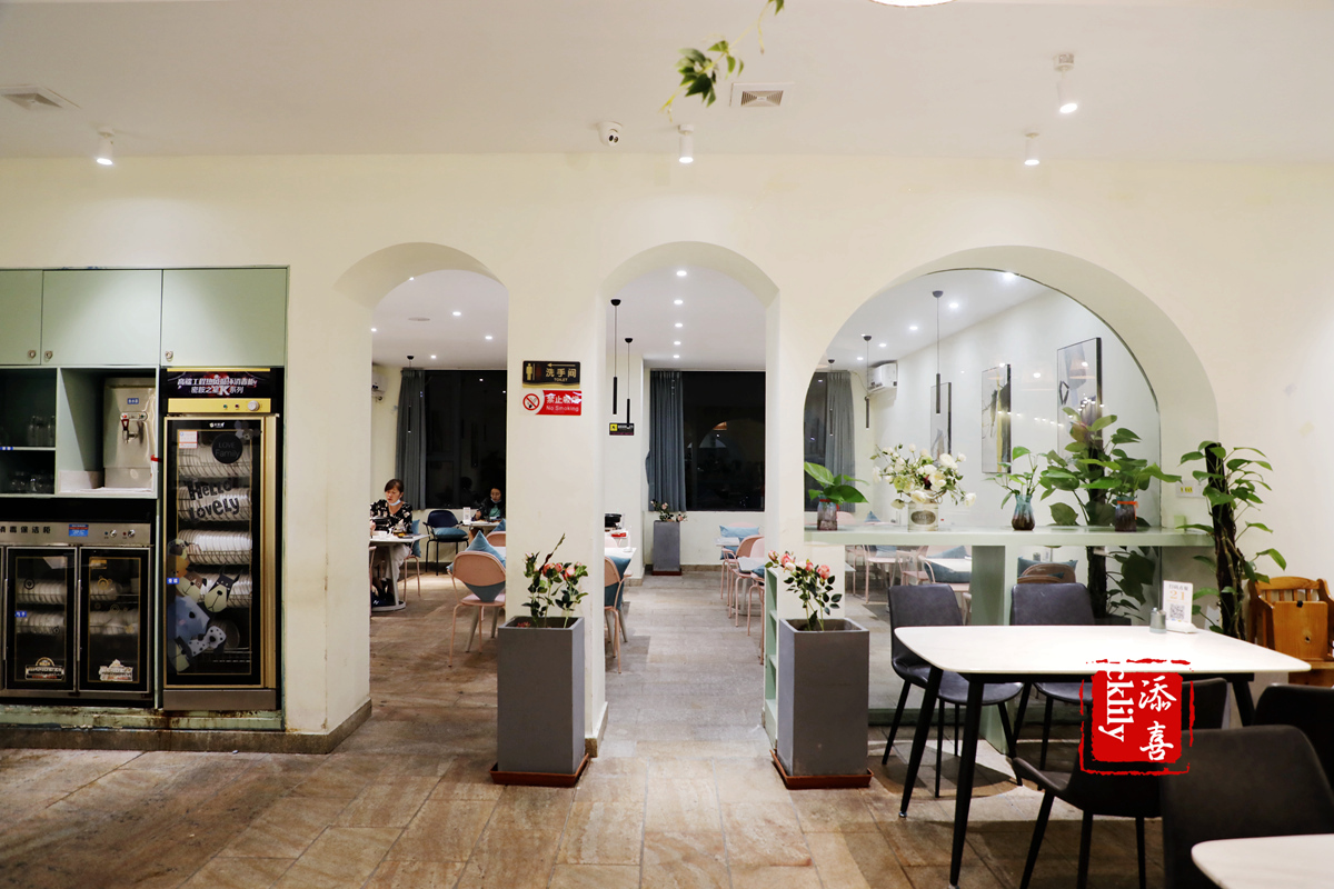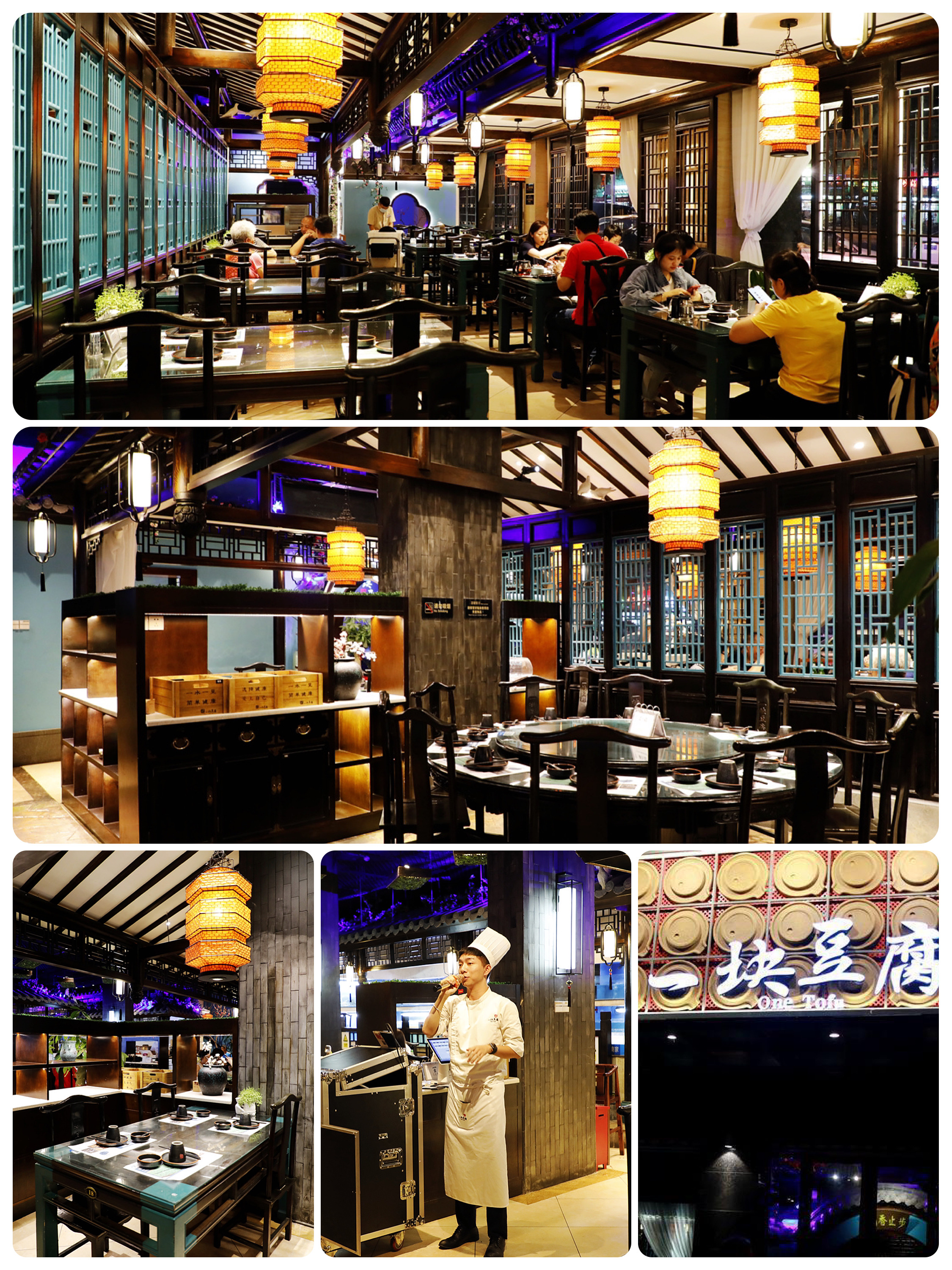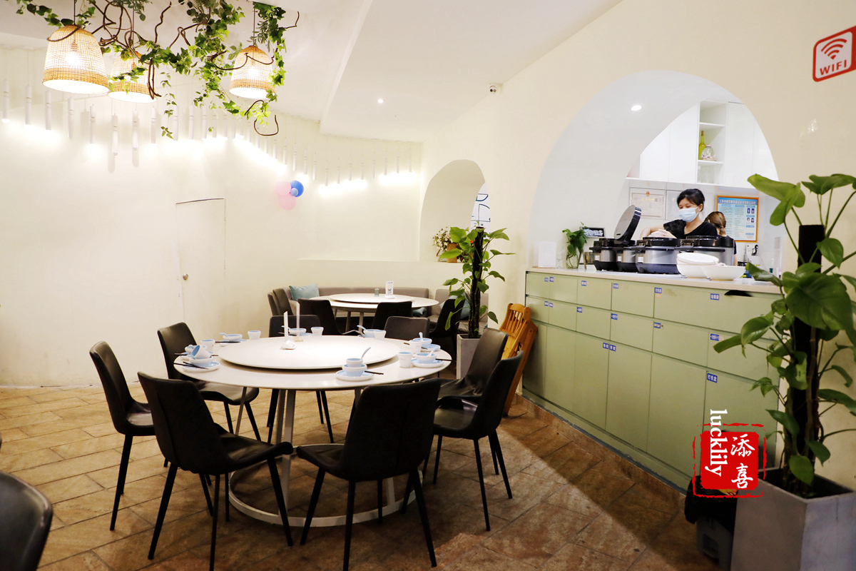 进入餐厅宛若穿越,园林式的店堂内复古的门槛、圆形的拱门、镂空的石窗,高板凳长方桌,餐厅吊顶都是做豆腐木方格搭建而成,店内的装修风格古朴风雅,店员着装都是古风系。这是一家养生概念餐厅,店铺以一块用心手磨的豆腐而出名,用绿色养生的食材,为顾客烹饪富有创意表现的健康美食,色香味俱全,老少皆宜;采用开放式4D厨房,打造360°无死角的洁净卫生加工区,后厨整洁有序,食客可以直观地看到明亮通透的无烟厨房;