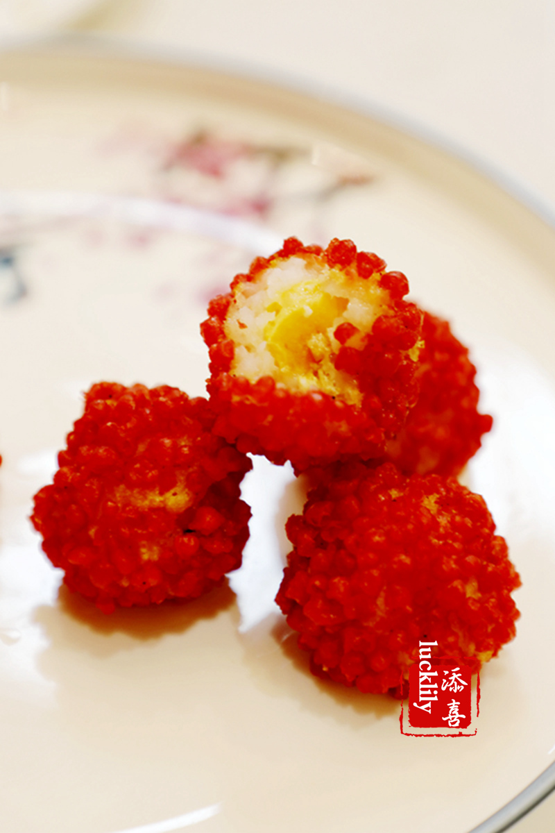 贵妃笑品虾:这个看上去一颗颗酷似杨梅的虾球口感可好了,难怪会在评价网上看到这个是排名第一的推荐菜,用的是新鲜的虾肉做成的馅儿,外城经过油炸成了带壳荔枝的模样。