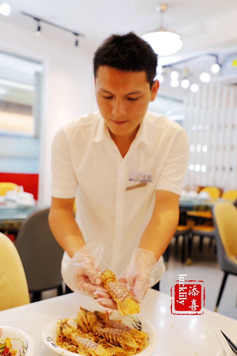 店员们都非常的亲和热情,入座就送上茶水,点单的时候店员还会拿着热水桶把客人的一次性碗碟烫一遍,这个细节真的非常的贴心。而且当菜端上来的时候,看到我点了皮皮虾,店长还亲自过来帮我剥虾。这样的服务在我的城市还没有!