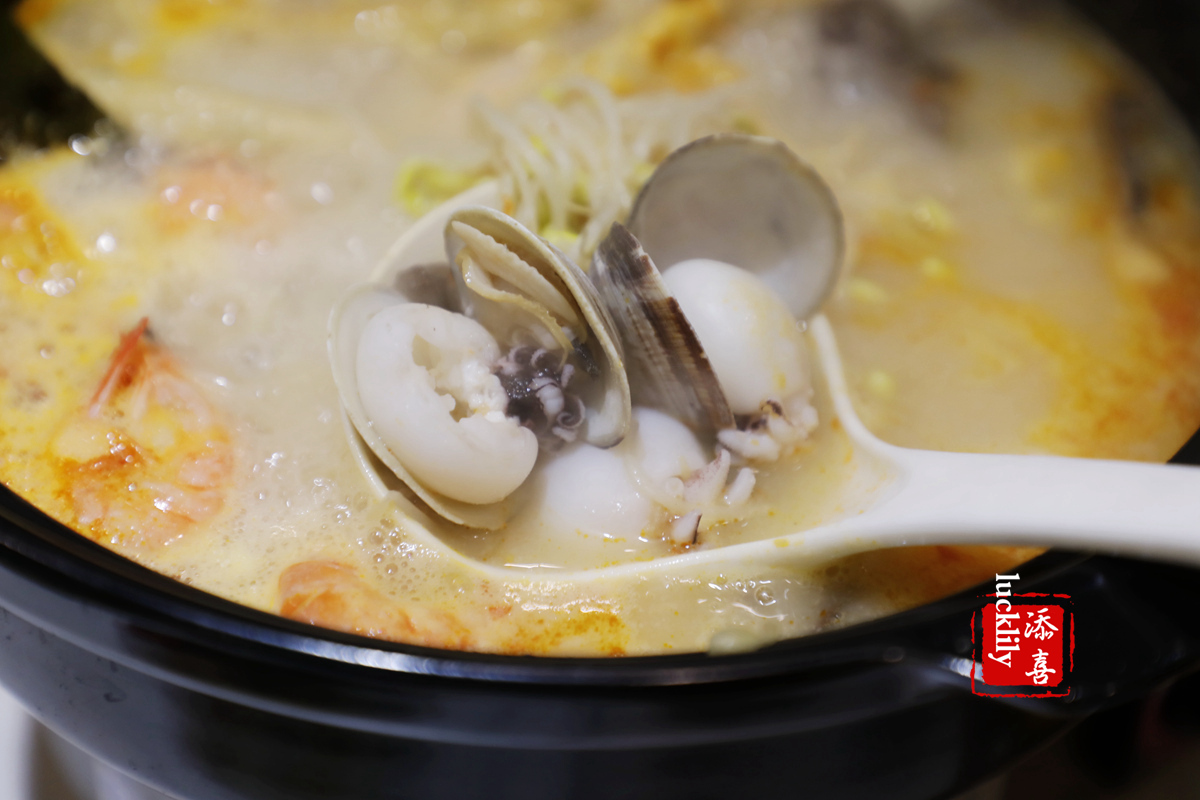 使用海南本地自然发酵的米糟。里面有虾、墨鱼仔🐙、鸭血等,吃起来酸辣可口,非常开胃!