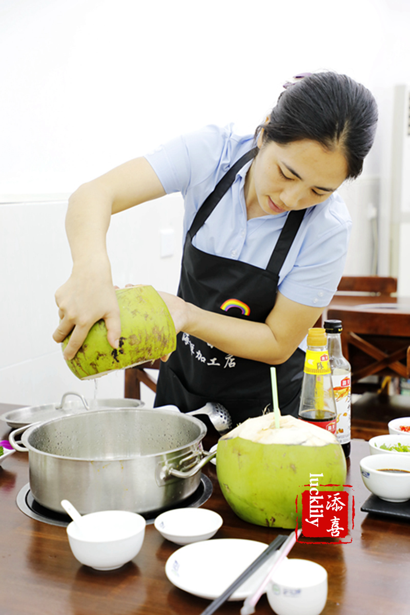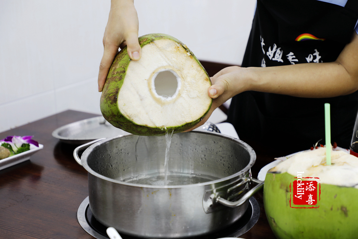 林姐椰子鸡用的是纯椰子水,客人下单之后,店员在后排现劈的椰子,当着客人的面将椰子水倒进不锈底锅中。椰子鸡火锅吃起来口感清甜、美味。