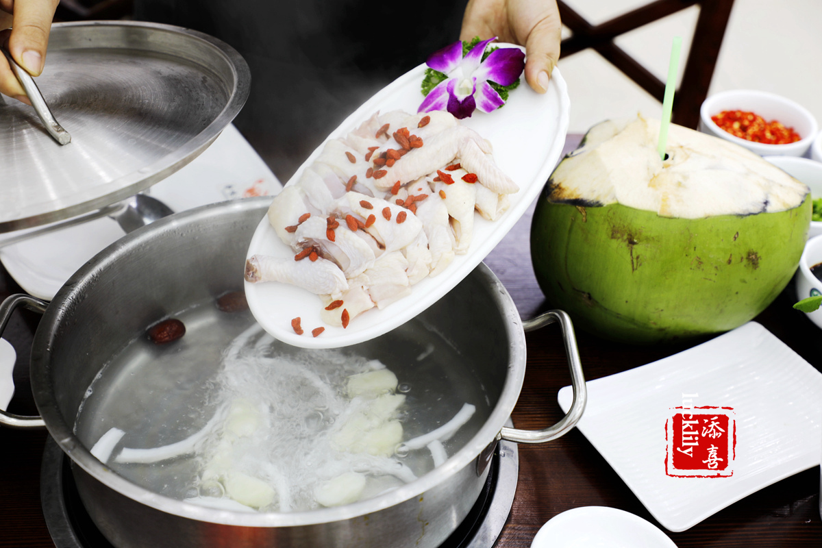 椰子鸡:鸡肉用的是海南文昌鸡,文昌鸡是国家地理标志产品,海南省文昌县的特色,有400多年的养殖历史,皮薄嫩滑,肉质鲜香。而且用来炖火锅,汤非常的清鲜,不带一点膻味儿。底锅用的是纯椰子水,与文昌鸡同时下锅的有椰肉条和红枣,都是清补养生的好食材。