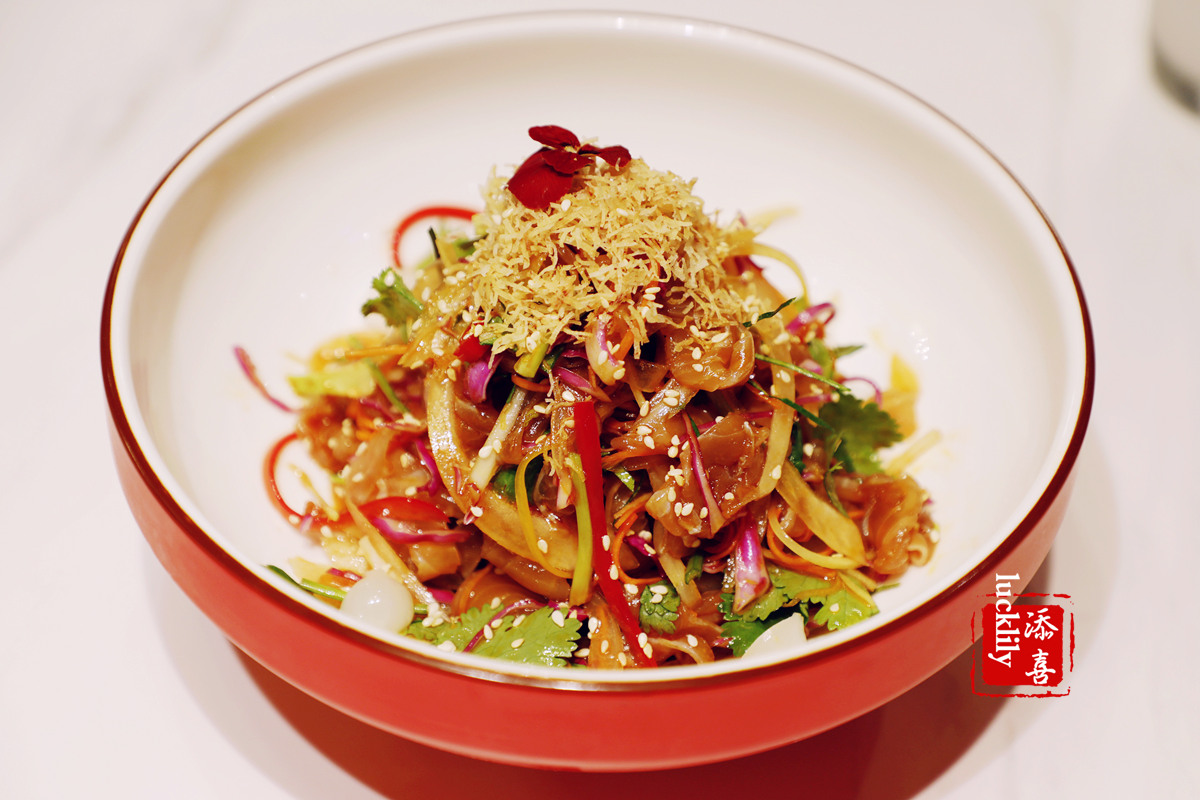 麻辣生捞红鲷鱼:在我国三亚,一直有“捞鱼生”在节日的时候,人们围坐一桌,把生鱼肉、配料和酱料倒在大盘里,大家一起挥动筷子,将它们捞拌均匀,一边还会喊着“捞啊、发啊”,我想参加过捞鱼生的客人对眼前的这盘菜一定像我一样充满美好的回忆和憧憬,眼前的这道麻辣生捞鲷鱼,用料讲究、摆盘精致,入口爽脆,麻辣鲜香。