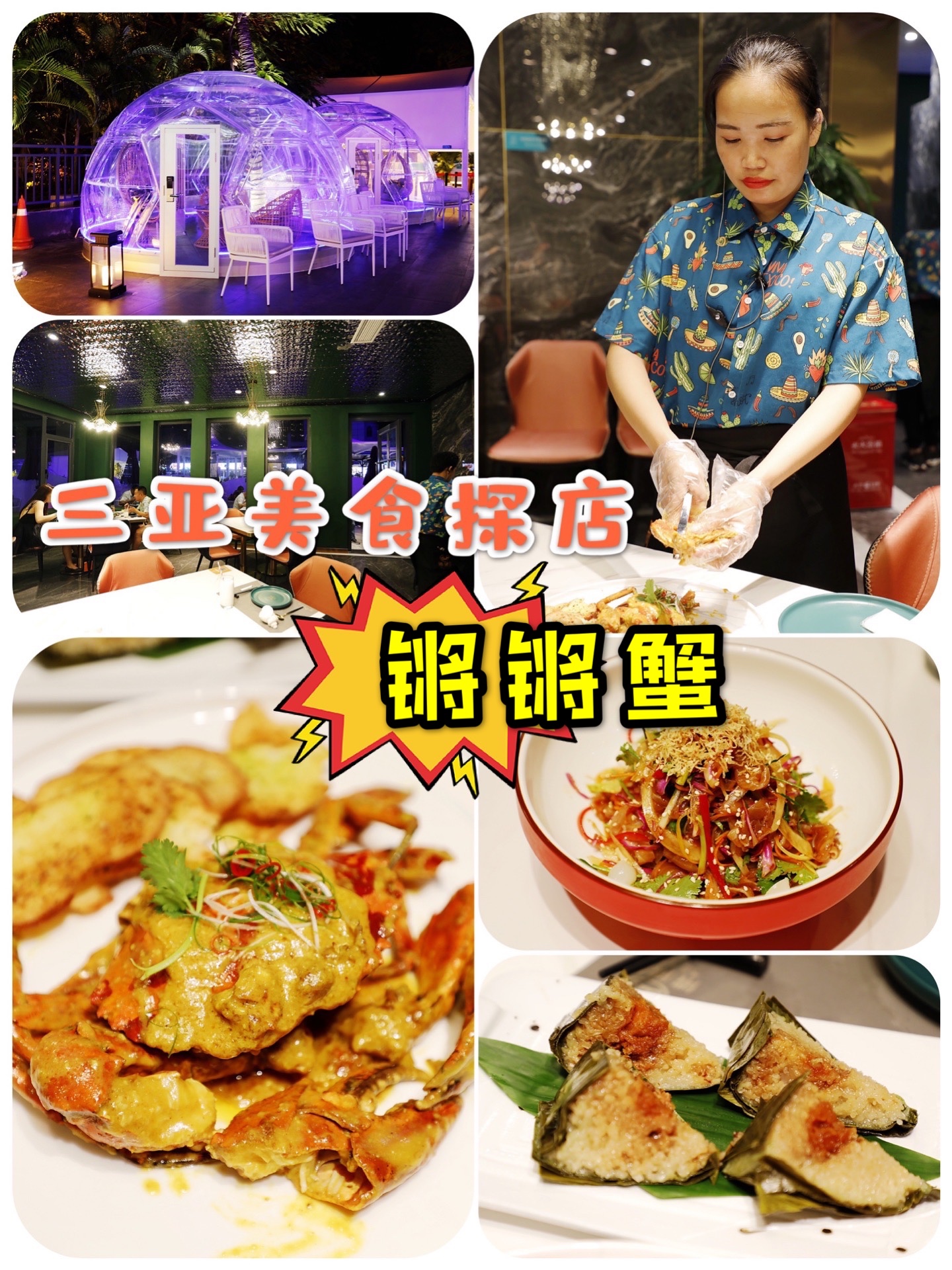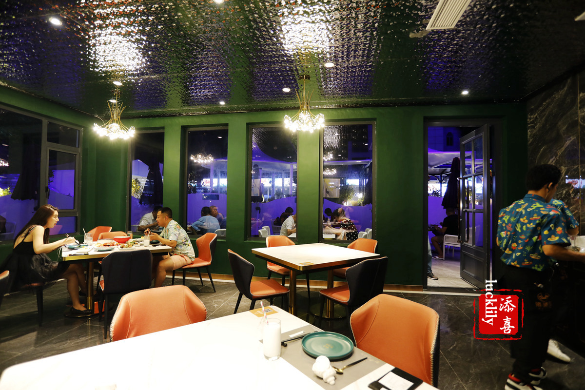海南院子真的是非常漂亮的夜景地,院子里好几家特色餐厅,锵锵蟹是正对进口的中间一家,餐厅有室内和户外的空间,室内一楼是大厅。