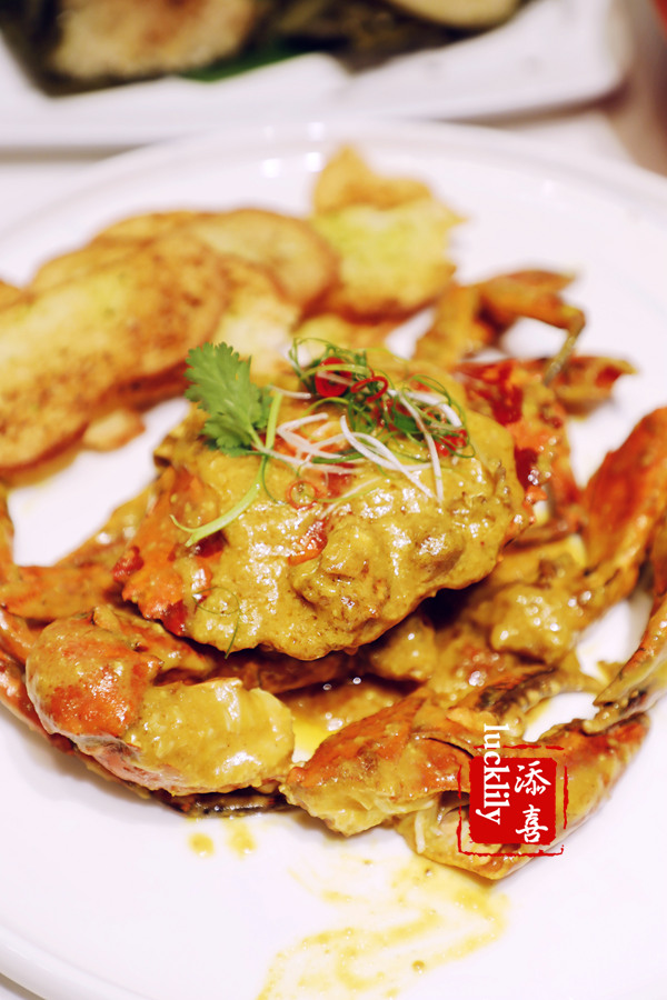 咸蛋黄酱炒蟹:蟹可是店里的头牌,入座点蟹,一般上桌也会稍晚一些,因为蟹都是现点活杀的,蟹的做法会让客人选,我最爱咸蛋黄,就要尝尝这咸蛋黄酱炒蟹啦,真是强烈推荐啊,蟹很饱壮,膏黄肉厚,浓郁的咸蛋黄酱真的令人好吃到吮指啊,一同端上了蟹钳和手套,上桌后服务生会提供拆蟹的服务,超级贴心!