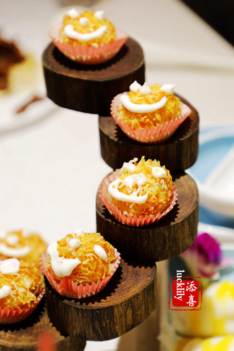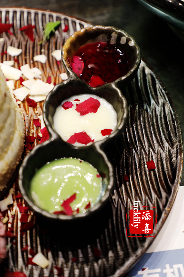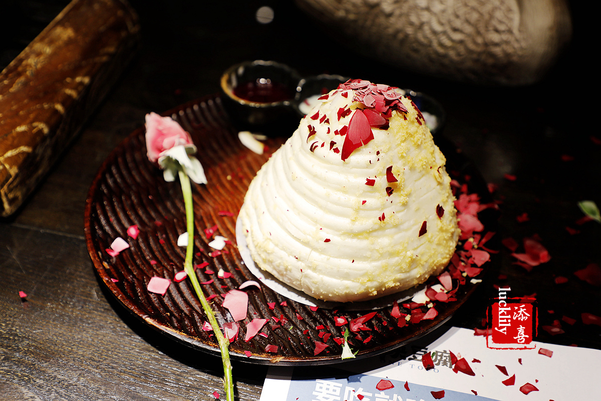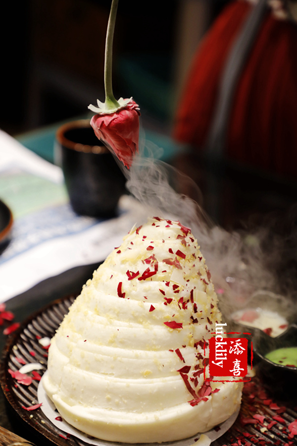 椰香花卷:奶香味十足的大花卷,口感甜美香软,重点更在于这道大花卷上桌时的仪式感,店员集体送上祝福的段子,客人亲手拍碎冻玫瑰,花瓣飘散在奶白色的大花卷上,美哭……