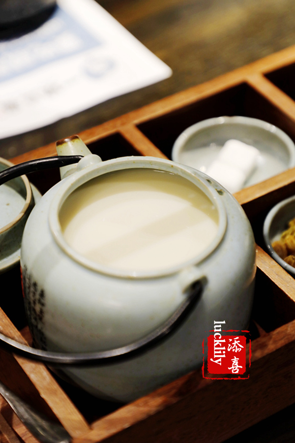 豆浆:就餐推荐搭配店内的鲜磨豆浆,装在古色古香的提篮里,古老的壶古老的杯,喝的不仅是醇香的豆浆,还有一份忆旧的情怀。