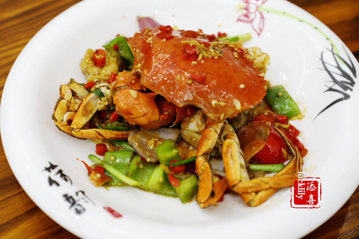 香辣蟹:新鲜的蟹,怎么做都好吃,冬天过来吃蟹时令最对了,蟹肉饱壮紧实,一个蟹里都是大块大块的肉,店里的调味料很单纯,海天系列的酱油、醋,很能够钵现蟹肉的清鲜。