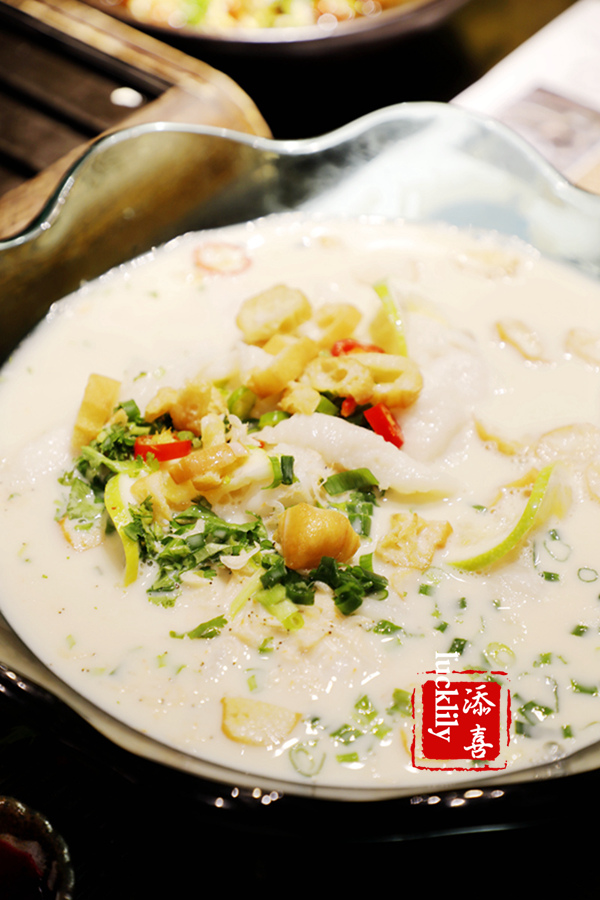养生豆浆鱼:用到无刺的龙利鱼,溜成薄片,上桌后将滚烫的豆浆淋在鱼片,鱼片生嫩鲜香,汤汁鲜美。