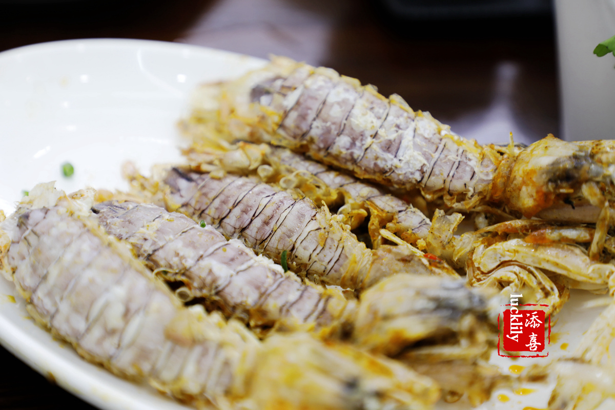 椒盐皮皮虾:真的非常感谢店长帮我把这4只硕大的皮皮虾完整地剥了出来,4只皮皮虾满满当当的占满了一盘子,虾肉饱壮紧实,背后都有一根厚厚的虾膏。