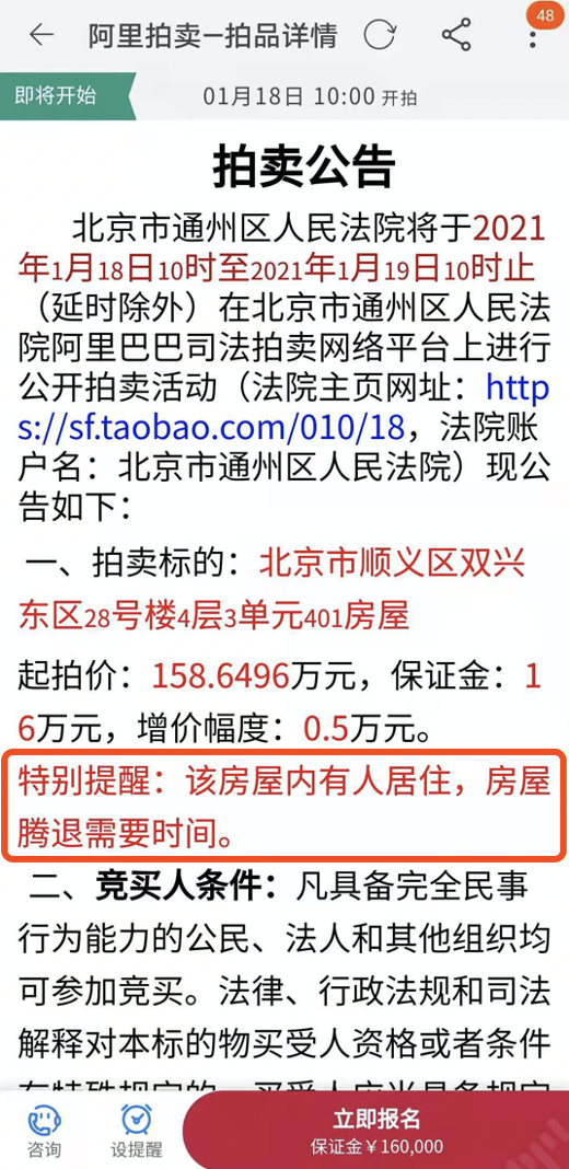根据58认证的法拍房信息,大叔在阿里拍卖网(淘宝网)找到了对应的正规房源。在与正规房源的对比以及与该法拍房经纪人的沟通中,大叔还发现了更坑的地方。
