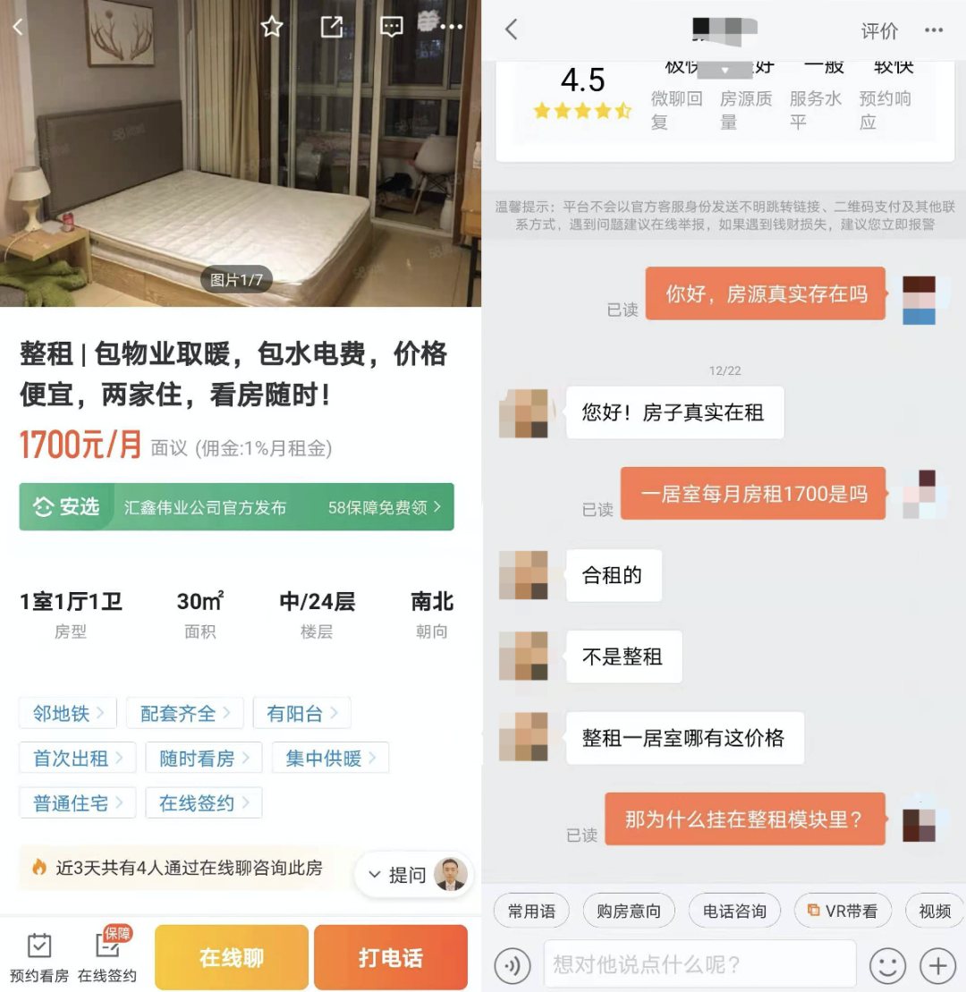 我在58同城整租模块里的安选房源找到一个1室1厅1卫的房源,报价1700元/月。一看就不靠谱儿,联系经纪人,他却表示房子真实在租。