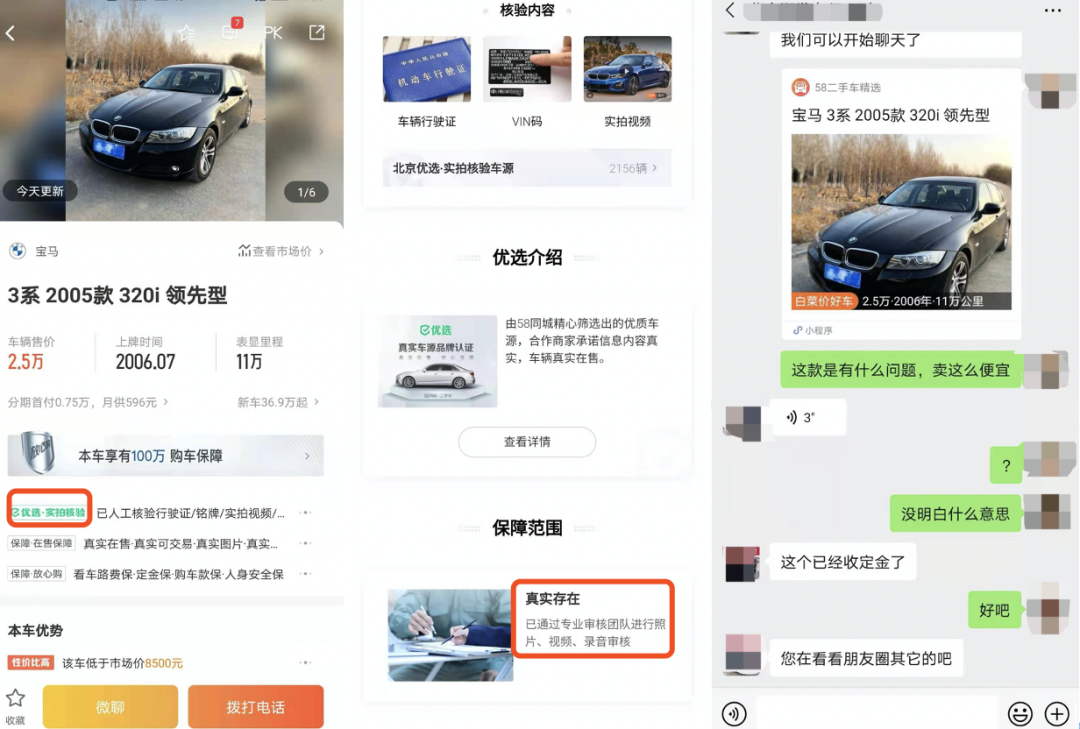 卖家要求微信沟通,随后在微信告知大叔这辆车已经有人买,他们也收了定金。如此说来这辆宝马320i已经不可卖,应该立刻下架。但一周后,大叔发现该车仍在优选模块里正常展示。跟“安选房”的套路一毛一样。