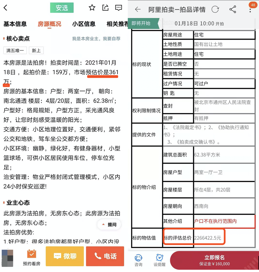 第一,阿里拍卖网该法拍房评估价为2266422.5元,而58同城认证真实的同款法拍房隐去了评估价,改为标注市场预估价361万,比阿里房源评估价高出134万!