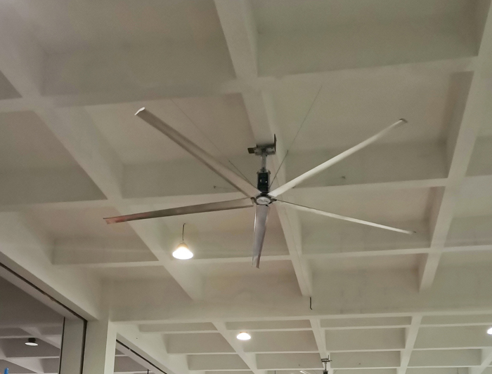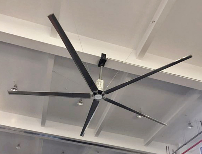 安伯玛工业大吊扇安装在4.5米以上高空,完全不影响地面机器工作,没有布线问题,并且一台工业大吊扇风量可以匹敌50台牛角扇。大风量,低能耗,一小时仅需1.5度电就可覆盖超过2000平方米的巨大面积。