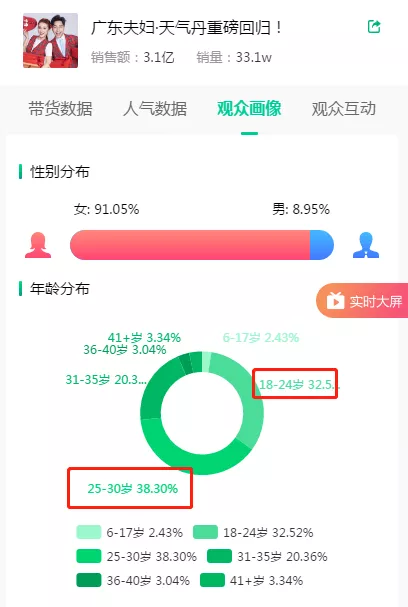 通过飞瓜数据的【观众画像】可以看到,广东夫妇直播间的观众非常精准,主要18岁-35岁的女性为主,他们正是高品质护肤品的目标受众。