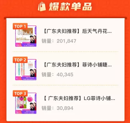 那么在广东夫妇直播间中,什么类型的商品比较畅销呢?这边我们选取了直播间商品销量Top3的数据展示。