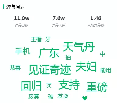 同时,直播间弹幕总数高达11万条,观众在直播间留言最多的就是“天气丹”、“支持”,说明主播的带货力爆棚,对于下单的引导做得特别好,直播间观众对于商品的讨论比较多,购买热情也很高。