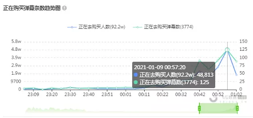 同时,我们发现直播间的“正在购买人数”峰值出现在00:57,虽然已经凌晨,但直播间的正在购买人数超过4.8万!