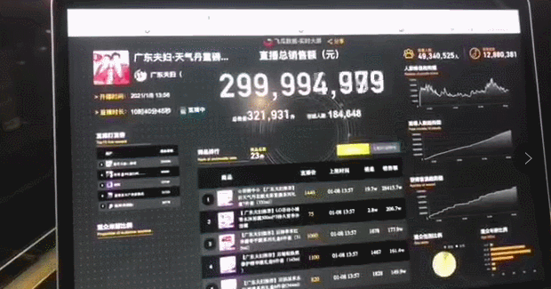 飞瓜数据作为专业的短视频和直播电商服务平台,为「广东夫妇」3亿直播间提供了现场“实时销售额大屏”支持,与直播间观众一同见证了3亿瞬间。