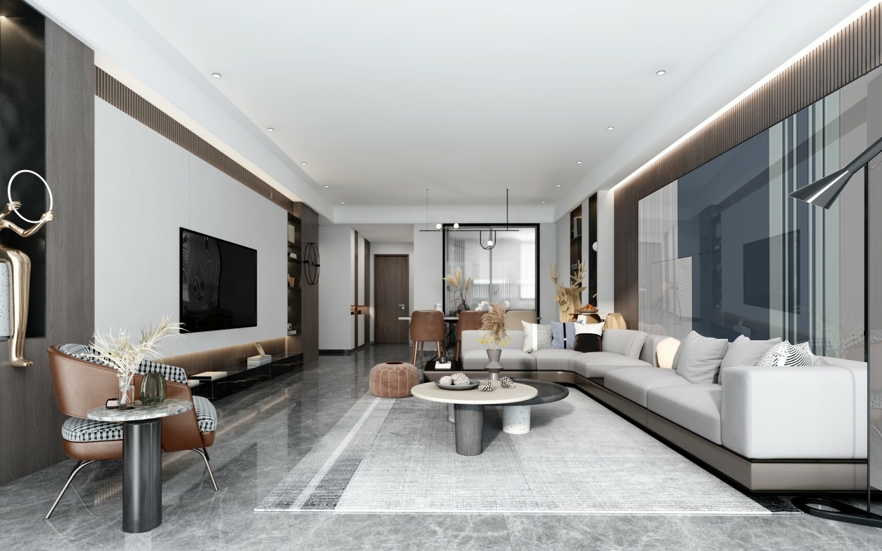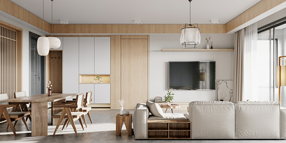 白色与原木色相互结合,营造出自然舒适的生活空间。电视墙定制组合柜,满足各种收纳需求,保持空间整洁。