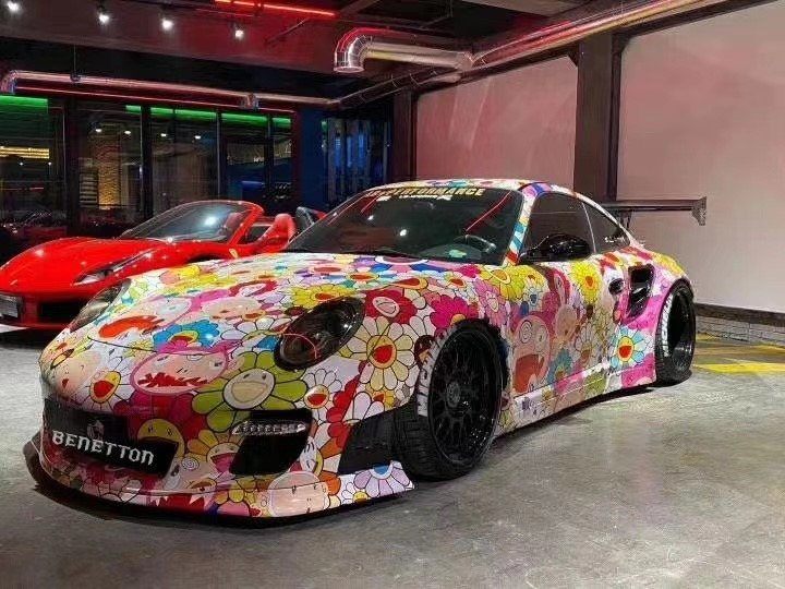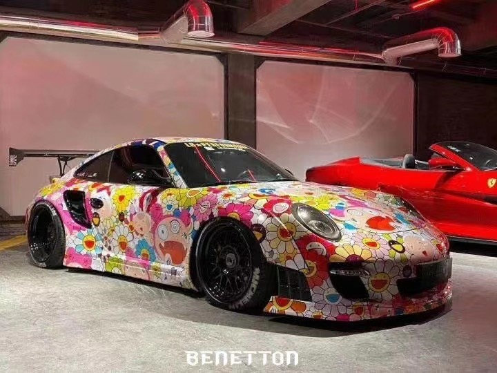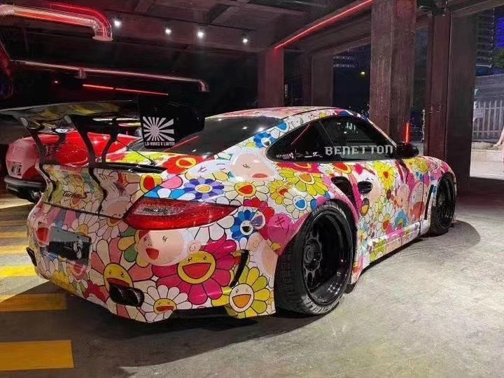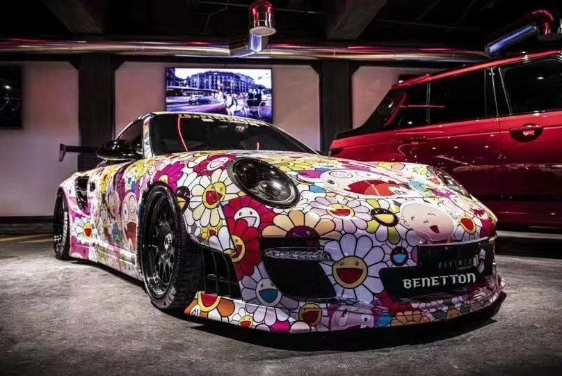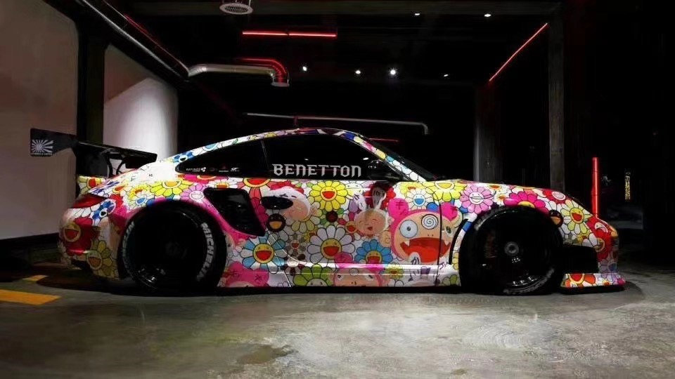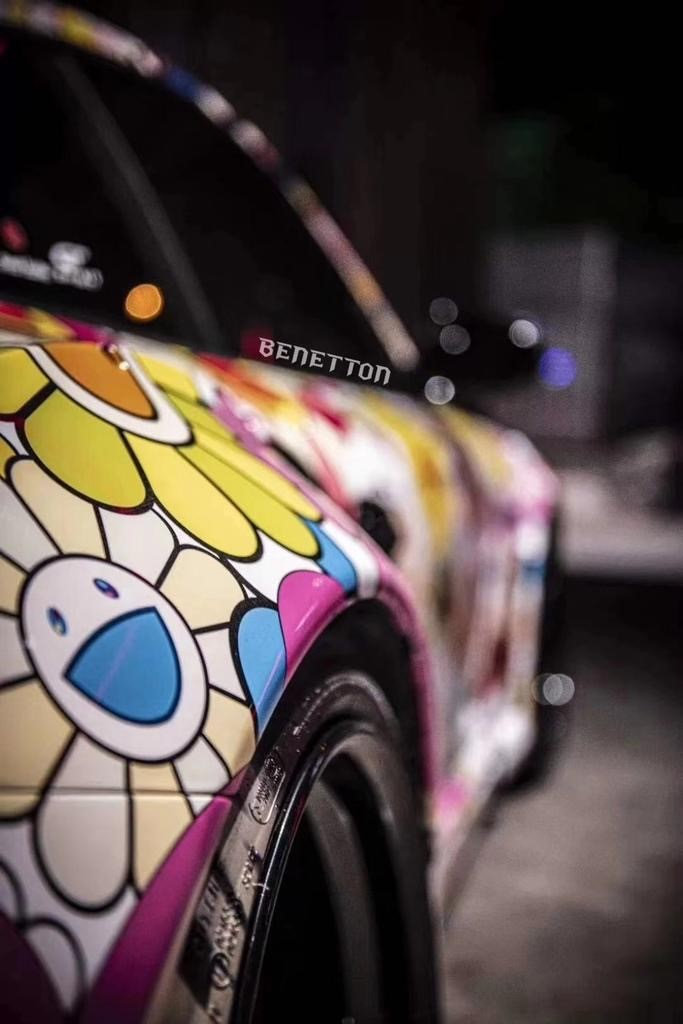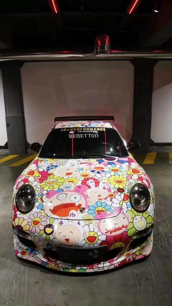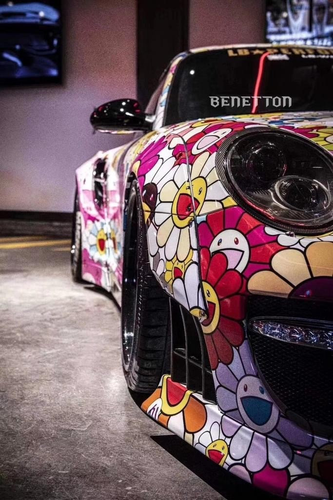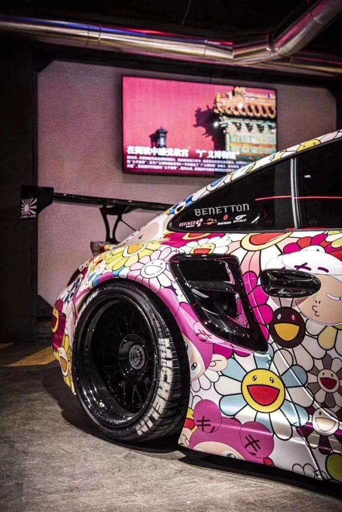 更特殊的是,眼前的这台911 Turbo S是经过涂装的,它采用了时尚的村上隆太阳花的图案。