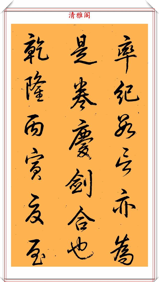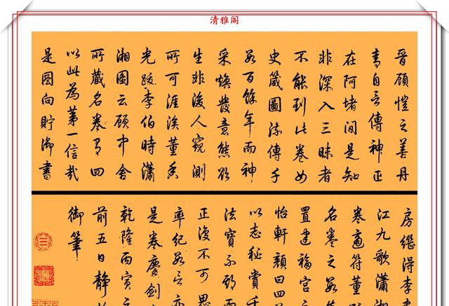 乾隆的书法结构严谨、笔法有致、绝没浮躁之风,且书法自成一体。在古代帝王当中,乾隆皇帝的书法也算排得上号的了,除了宋徽宗和毛这种自成一派的。当然跟书法大家比确实有一些差距,毕竟人家专业是做皇帝而不是写字。