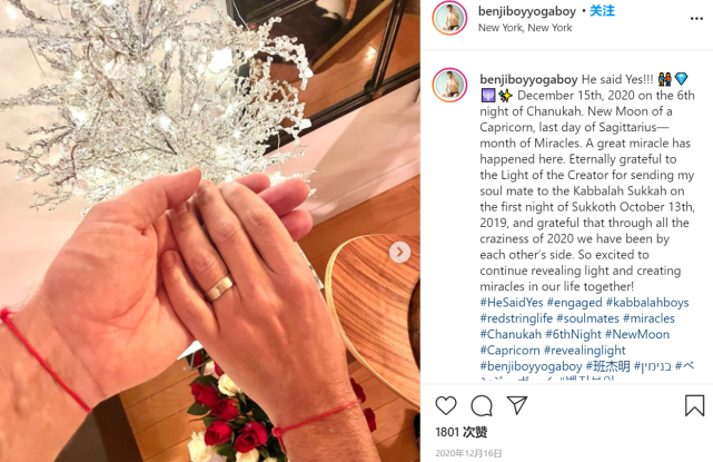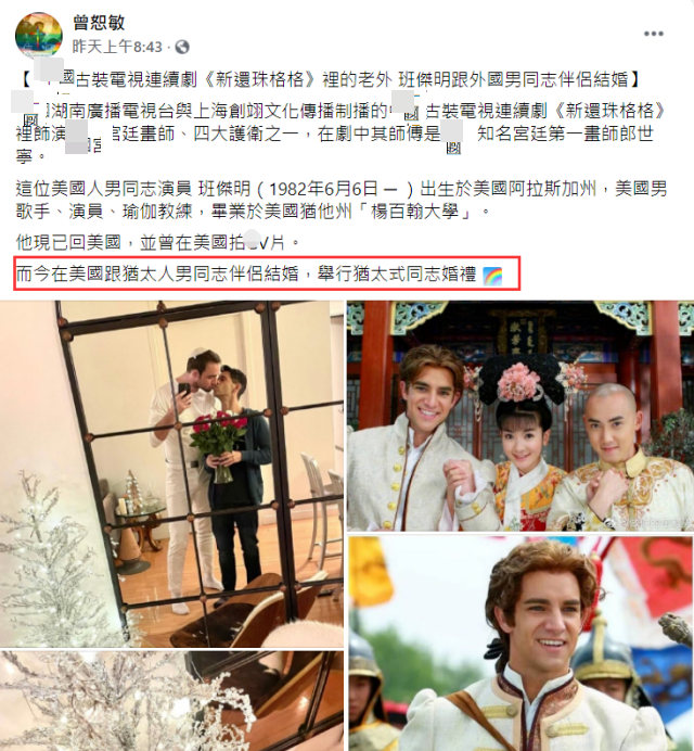 就在1月12日,关心同性婚姻问题的曾恕敏在社交平台透露,班杰明现已回到美国,而且已经跟另一半完婚,两人举行的是犹太式婚礼。