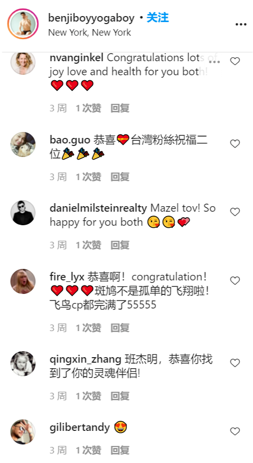粉丝们对此也都大方送上祝福:“恭喜!祝福二位!”“斑鸠不是孤单的飞翔了,飞鸟CP都圆满了,555~”“班杰明,恭喜你找到了你的灵魂伴侣。”