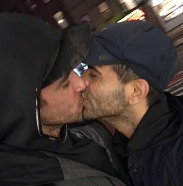 两人站在镜子柜前,一黑一白,看起来异常和谐,男友手里捧着一束花,抬头向潘杰明看去。潘杰明则一手拿着手机一手搂着男友与他拥吻,两人看起来很是甜蜜幸福。