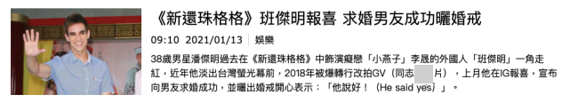 去年12月中旬,潘杰明在社交平台上宣布求婚男友成功的喜讯,很开心的表示:“他说好!(He said yes)”并且晒出了两人的甜蜜接吻照和婚戒。