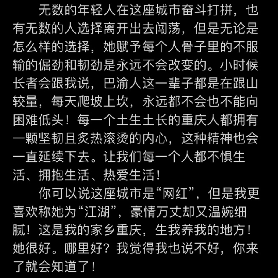 这在他对《奇妙之城》写的文章里,就能看出来。在文章最后的一段,他写道:每一个土生土长的重庆人都拥有一颗坚韧且炙热滚烫的内心,这种精神会一直延续下去,让我们每一个人都不惧生活、拥抱生活、热爱生活。
