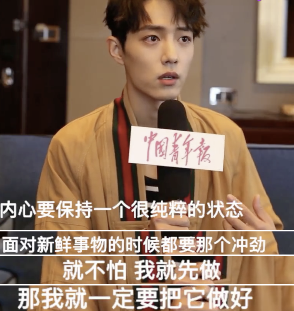 拍完《陈情令》接受采访被问与魏无羡相似的地方,他说遇到困难不会轻易放弃,会想办法解决。还说少年感就是内心要保持很纯粹的状态,面对新鲜事物都要有那个冲劲儿,就不要怕,先做,并且努力做好它。