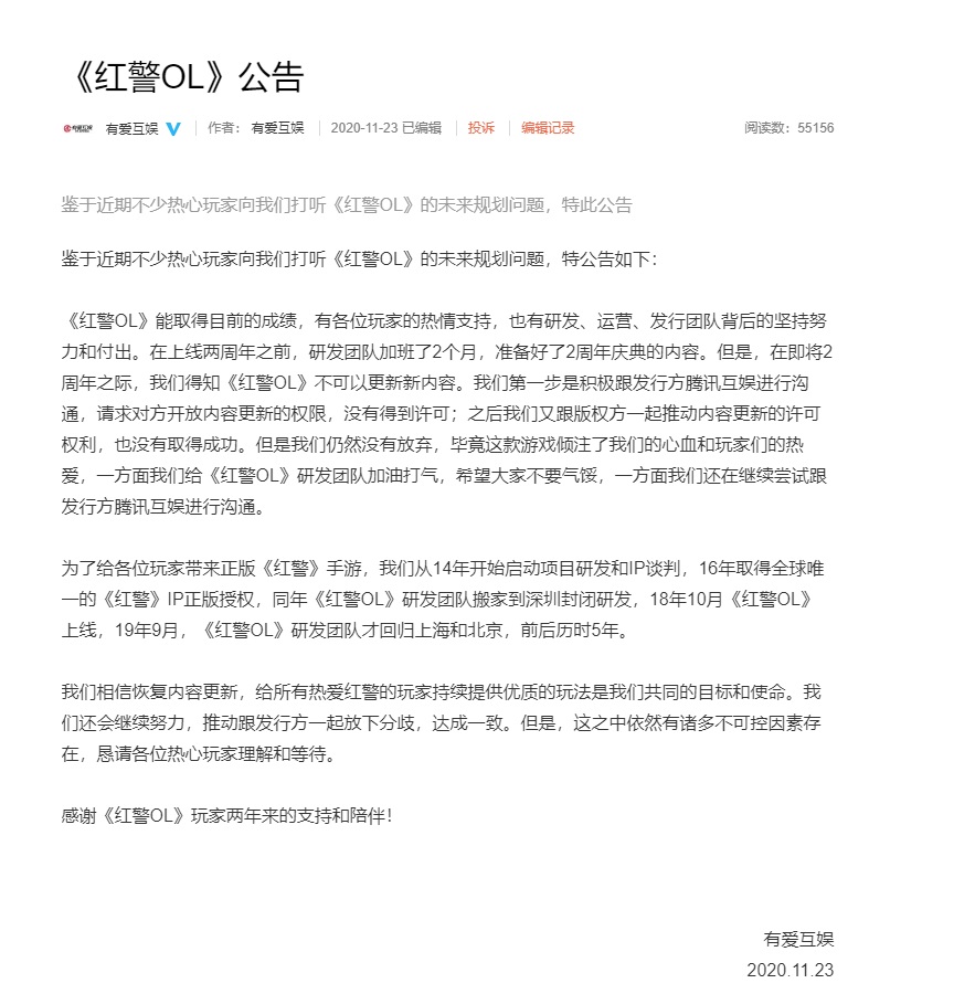 2020 年 11 月 23 号,有爱互娱官方微博针对《红警 OL》2 周年庆典活动未如期更新等问题发布公告:“研发团队为准备两周年庆典内容加班 2 个月,但后期被腾讯互娱方面告知《红警 OL》不可以更新新内容。我们第一步是积极跟发行方腾讯互娱进行沟通,请求对方开放内容更新的权限,没有得到许可;之后我们又跟版权方一起推动内容更新的许可权利,也没有取得成功。”