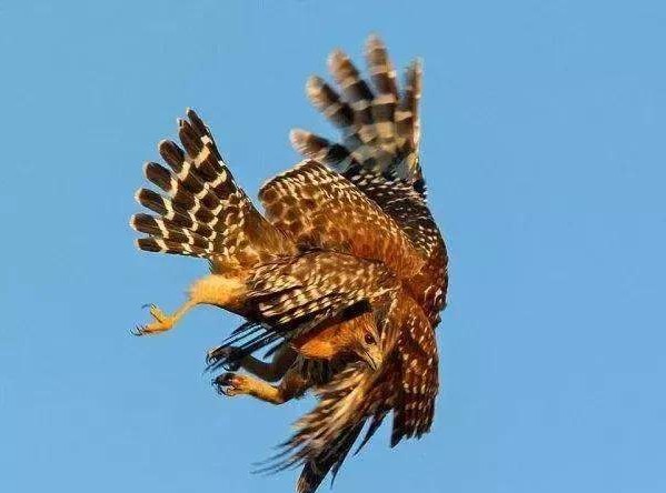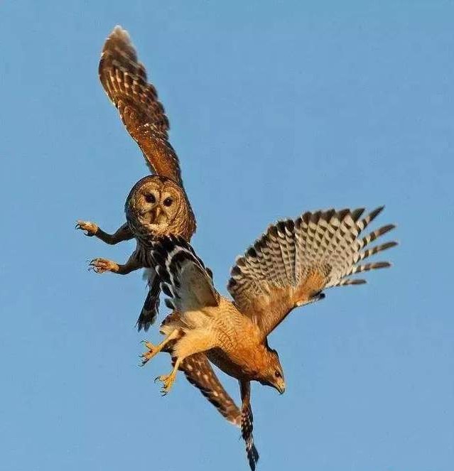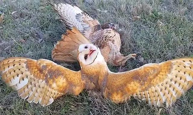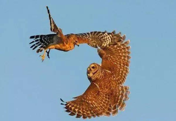 猎鹰是优秀的天空猎手,它们心梗迅捷,出手快如闪电,很多鸽子、麻雀等小鸟见到它都会匆忙躲避。而猫头鹰却无惧它,每次猎物飞到猫头鹰巢穴附近,猫头鹰都会升空进行反击驱离,它们很快就缠斗在了一起,一时间难分胜负。