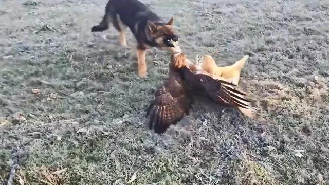 此时,牧羊人的猎犬也赶了过来,它想来个黄雀在后,结果猫头鹰和游隼瞬间分开,并且共同对猎犬进行了攻击,它们的利爪同时抓向了猎犬,猎犬鼻子受伤后逃离,而猫头鹰和游隼则就此分开,各自飞走。