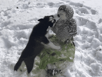 当然,猫头鹰也是可爱的动物,呆萌的猫头鹰和哈士奇这一对萌物在一起就十分和谐,看来猫头鹰对没有威胁的动物还是很友好的。