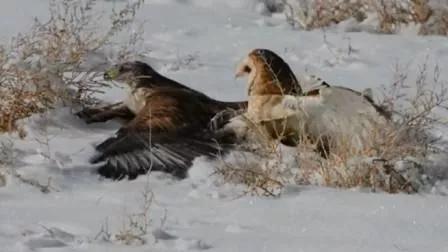 一只猫头鹰将一只老鹰按在了雪地上,经过一番缠斗之后,老鹰想要逃离的时候,被猫头鹰从背后偷袭,牢牢地抓住了它的尾部,老鹰精疲力尽后不得不降落到雪地上,试图挣脱对手,但是由于冬季捕食困难,猫头鹰也付出了很多体力,所以最终猫头鹰没有轻言放弃,它成功的捕食了这只老鹰。