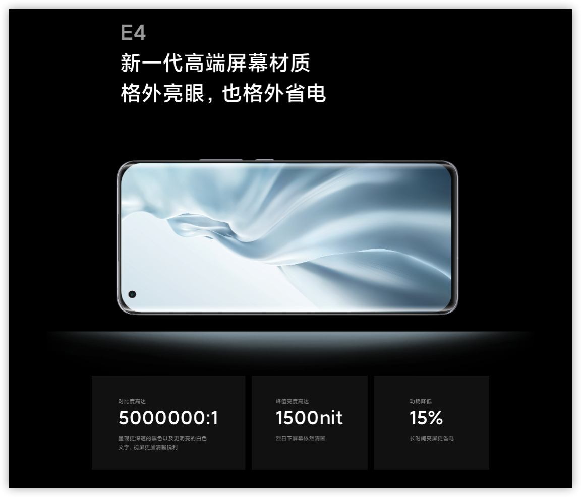 小米 11 使用的 E4 是三星最新的 OLED 发光材料。对比上一代 E3 材料,E4 主要的升级点在于峰值亮度、对比度和功耗,比如小米 11 的局部峰值亮度飙升到 1500nit,对比度升级至 5000000:1,功耗则降低了 15%。