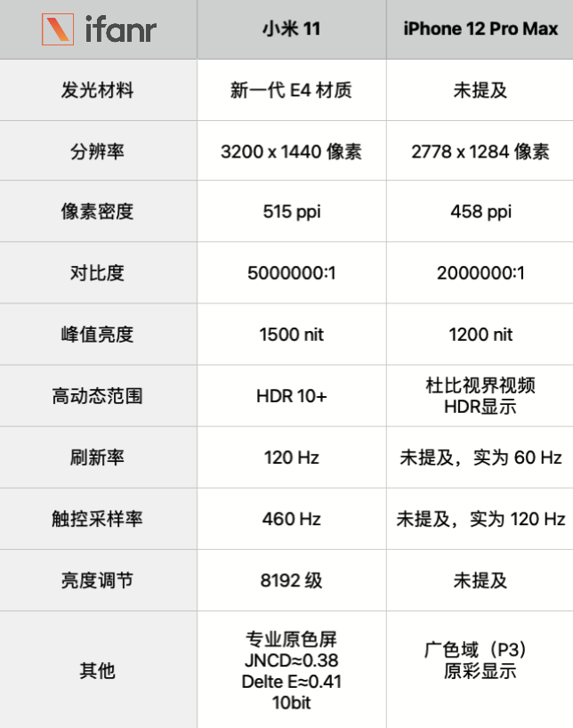 小米在官网上还给出了具体数值:JNCD≈0.38;Delte E≈0.41。iPhone 12 Pro Max 虽未标出相关参数,但据 displaymate 的数据,其平均颜色误差为 0.9 JNCD,也属于非常优秀的水平。