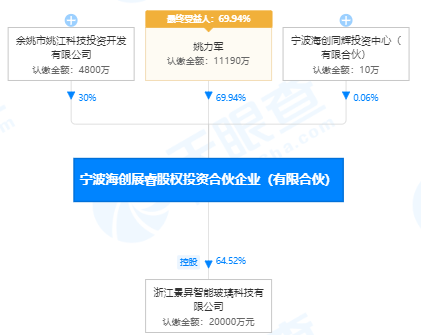 其中,姚力君出资11190万元,占比69.94%,余姚市姚江科技投资开发有限公司出资4800万元,占比30%,宁波海创同辉投资中心(有限合伙)出资10万元,占比为0.06%。