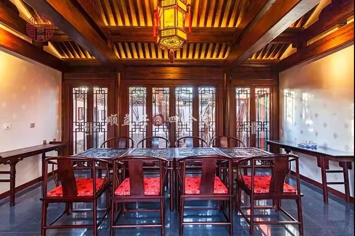 穿过庭院,步入中堂之中,一色红木家具十分的显眼。中堂进深约6米,门窗采用的是七架梁的建筑结构,阳光可通过门窗照进室内。