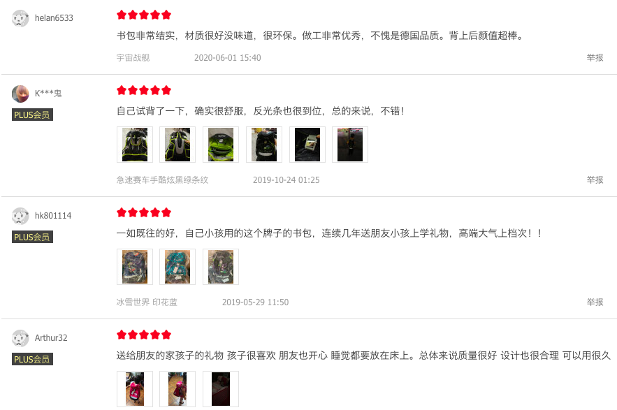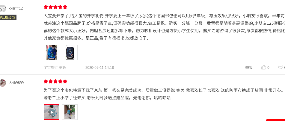德国ergobag是小学生系列护脊书包,同属于该公司FOND OF的还有3-6岁幼儿园小朋友系列书包品牌Affenzahn,还有18年刚刚进入中国就受到极大欢迎的针对身高140-180的中学生护脊书包系列GotYaSatch,这个品牌大学生也可以背。同属于FOND OF的缘故,它们的京东旗舰店叫做方弗旗舰店,下图是真实摘录的该店铺买家评价,中国家长对ergobag的认可和信赖足以表达。
