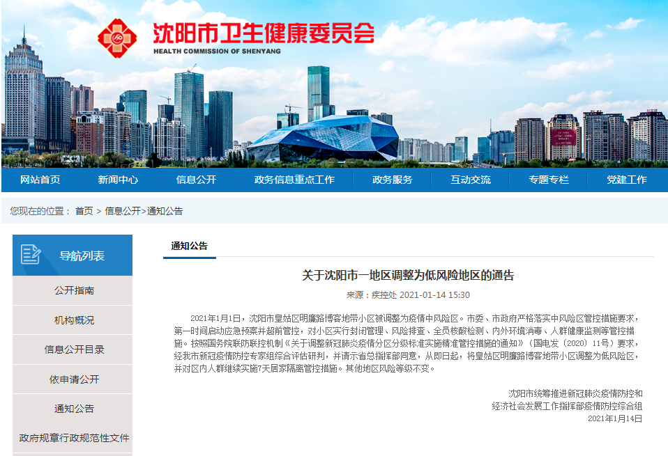 据沈阳市卫健委消息:2021年1月1日,沈阳市皇姑区明廉路博客地带小区被调整为疫情中风险区。市委、市政府严格落实中风险区管控措施要求,第一时间启动应急预案并超前管控,对小区实行封闭管理、风险排查、全员核酸检测、内外环境消毒、人群健康监测等管控措施。按照国务院联防联控机制《关于调整新冠肺炎疫情分区分级标准实施精准管控措施的通知》(国电发﹝2020﹞11号)要求,经我市新冠疫情防控专家组综合评估研判,并请示省总指挥部同意,从即日起,将皇姑区明廉路博客地带小区调整为低风险区,并对区内人群继续实施7天居家隔离管控措施。其他地区风险等级不变。