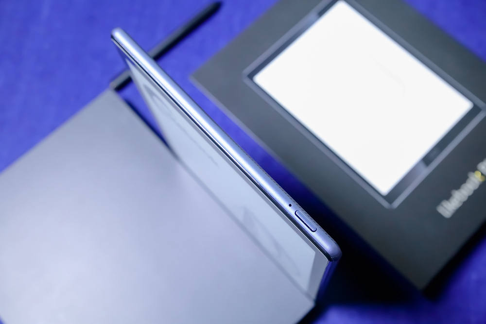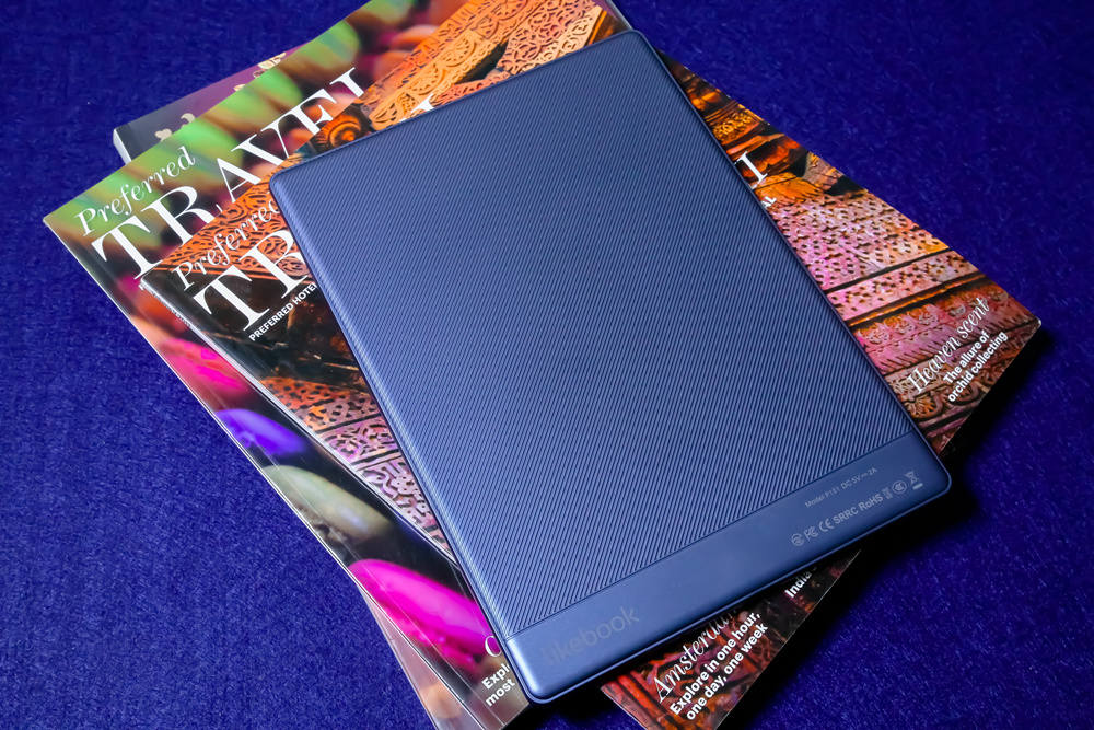 博阅Likebook P10的背面采用了蓝色细斜纹的商务风格设计,相比于简单的平板式背板更加雅致、有品位,更人耳目一新的感觉。而且根据官方介绍,阅读器背板的内部还有模内注塑的铝镁合金结构,使得产品整体结构非常坚固,更加的抗压、耐摔。