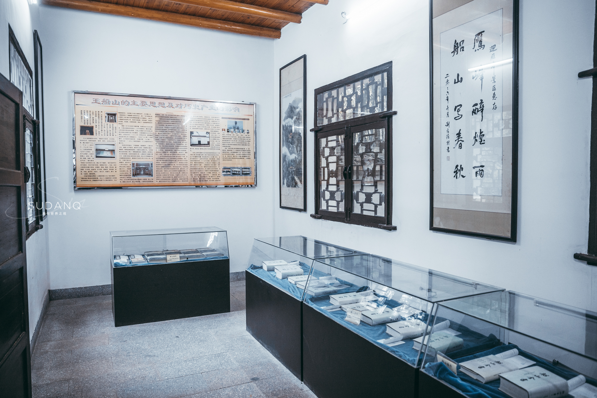 纪念馆正中是一座王船山半身塑像,右展厅是明清时期的雕花木床、木椅及带补丁的蚊帐、被褥等船山先生的卧室家居用品,座展厅陈列着木屐、雨伞、油灯等物品及王船山毕生著作《船山全书》和后人研究船山思想的部分作品。